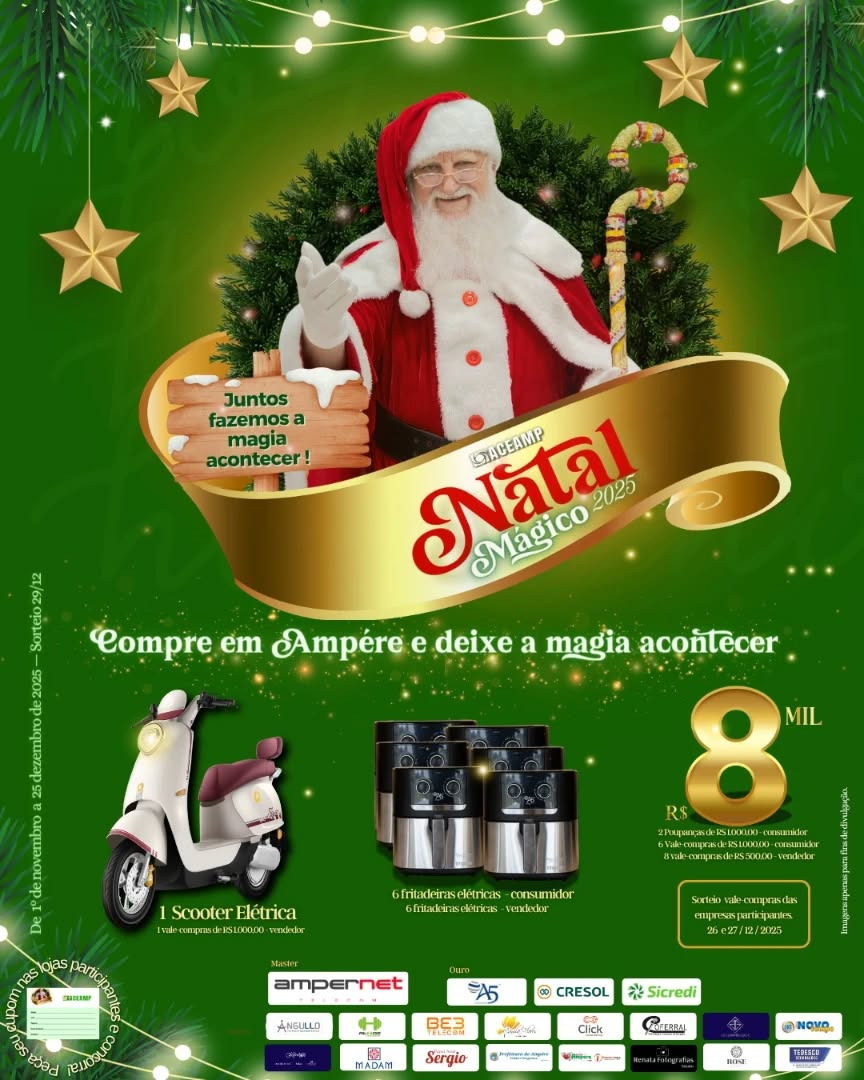 A campanha também irá premiar consumidores e vendedores, incentivando as compras no comércio de Ampére. Entre os prêmios estão uma scooter elétrica, fritadeiras elétricas e vales-compra que totalizam R$ 8 mil. O período da promoção vai de 1º de novembro a 25 de dezembro, com o sorteio final marcado para o dia 26 de dezembro.
