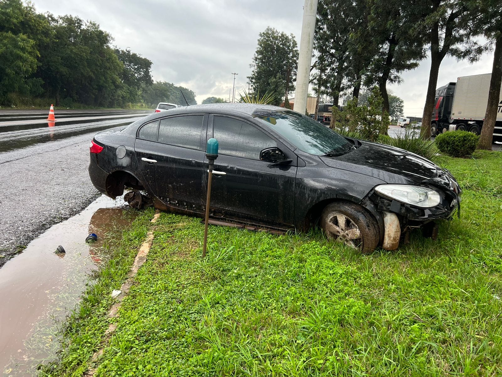 Um veículo Renault/Fluence, cor preta, placas de Realeza, saiu da pista e colidiu contra luminárias que ficam as margens da via, próximo à entrada de um posto de combustível. Uma das rodas do carro foi arrancada com a força do impacto.