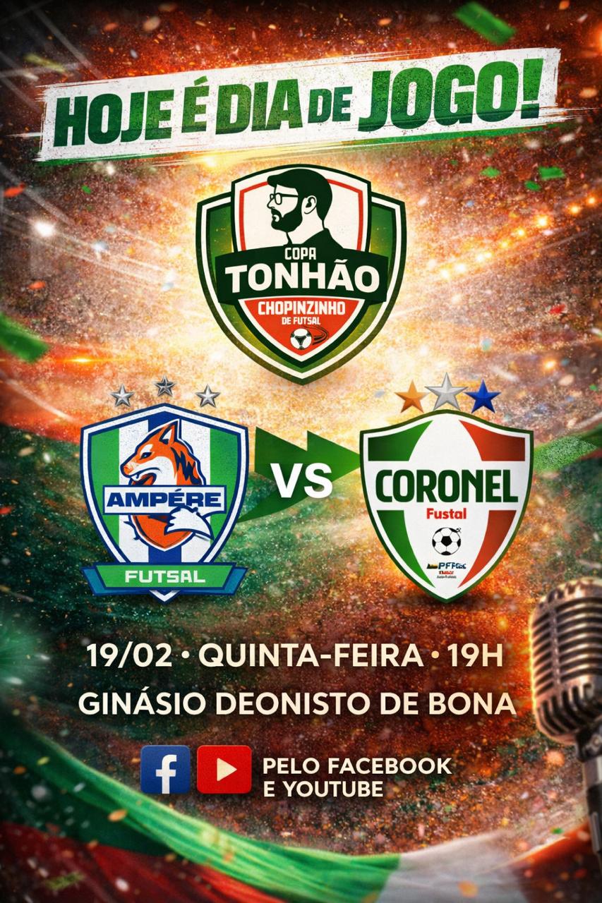 O Ampére Futsal volta à quadra na noite desta quinta-feira (19) em busca de mais uma vitória na Copa Tonhão Chopinzinho 2026. A Raposa enfrenta o Coronel Futsal, às 19h, no Ginásio Deonisto Debona, pela segunda rodada da competição. Após estrear com triunfo, o time amperense quer manter o aproveitamento de 100% e encaminhar a classificação para a semifinal do torneio.