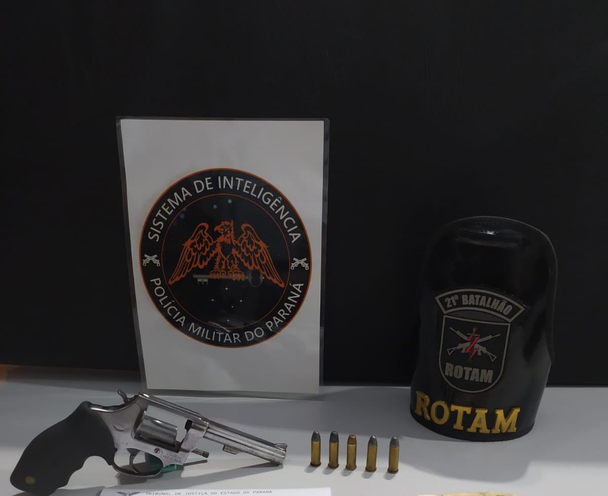 Foi realizada a abordagem aos presentes, onde o indivíduo prontamente informou à equipe policial que estava armado, sendo que a arma estaria em sua cintura. Após busca pessoal, foi localizado em sua cintura um revólver taurus cal. 38, municiado com 05 munições do mesmo calibre. Ainda, em consulta ao sistema, verificou-se que existia um mandado de prisão em desfavor do mesmo, expedido pela vara de execuções penais de Francisco Beltrão.