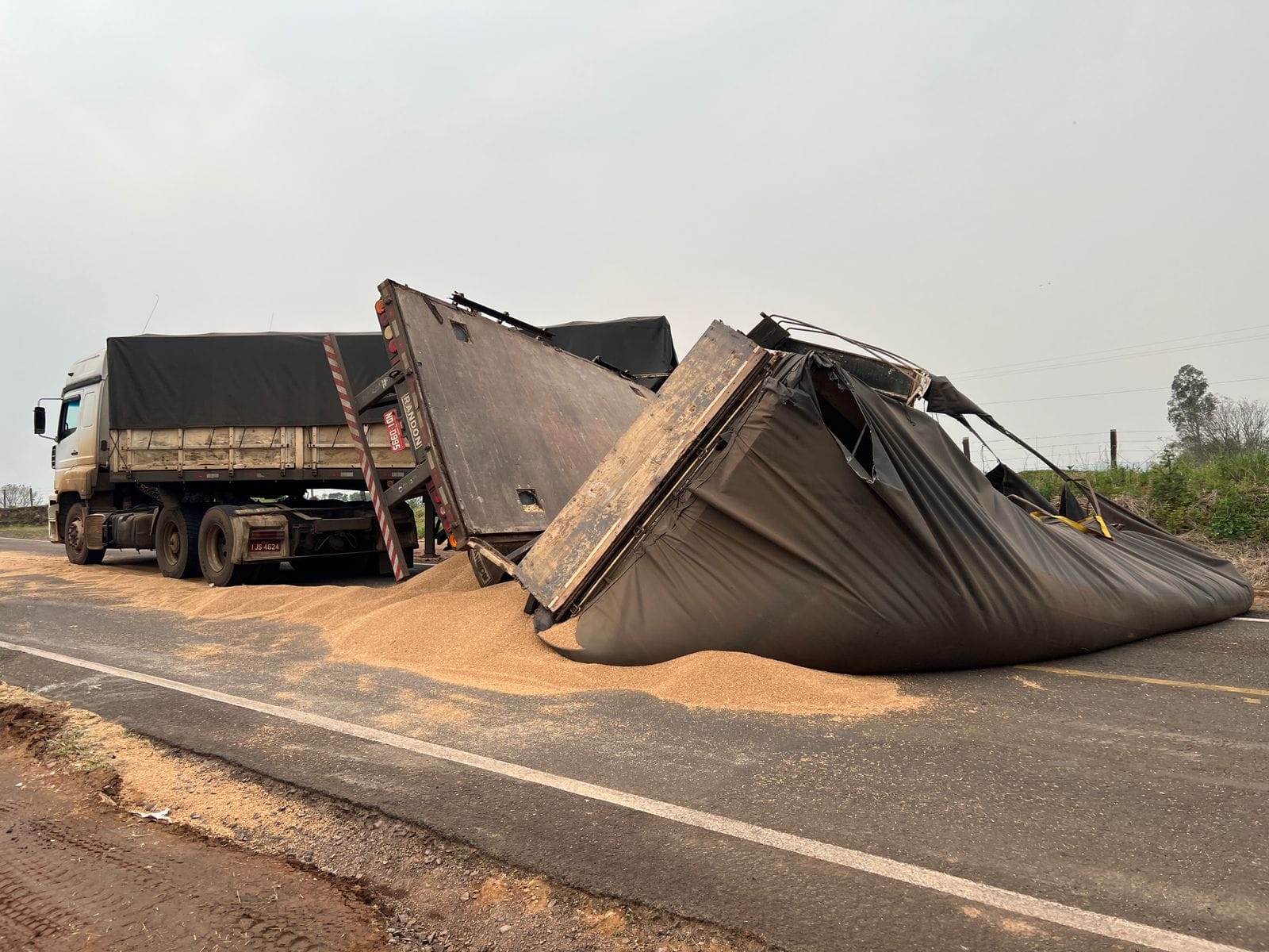 Uma das carrocerias do veículo acabou tombando. O trânsito na via segue em uma pista. O motorista não se feriu.