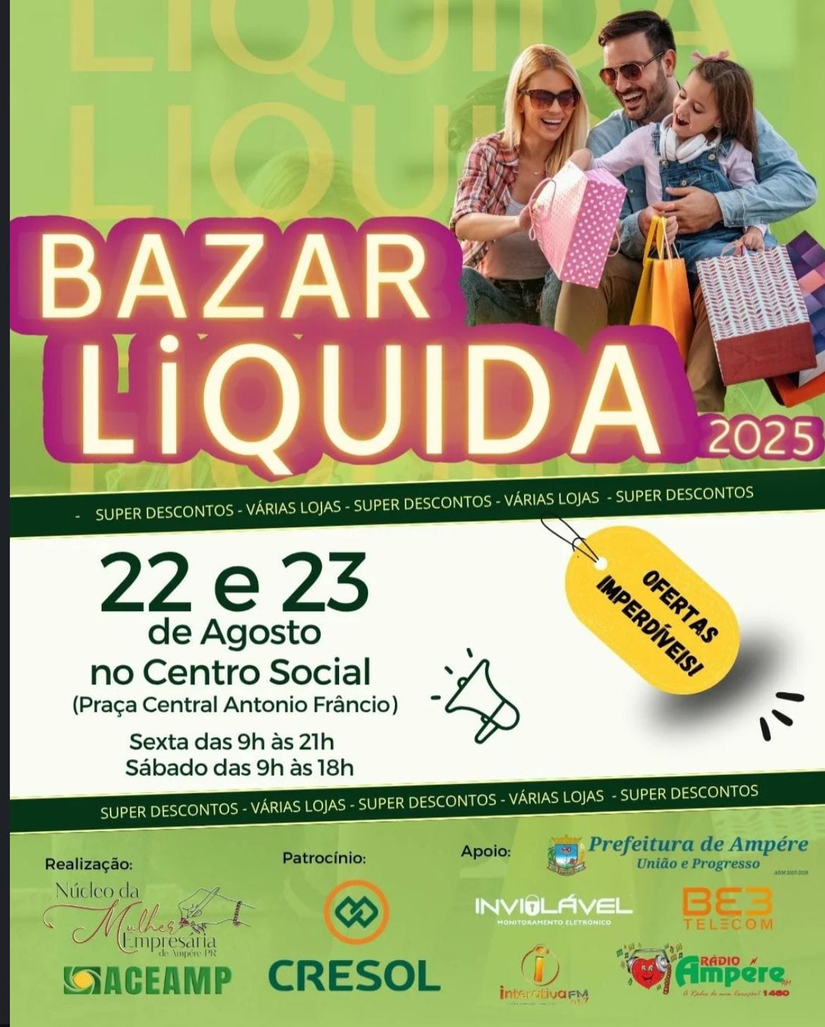 O Núcleo da Mulher Empresária de Ampére (NME/ACEAMP), realiza nesta sexta-feira, 22, a abertura oficial do Bazar Liquida 2025, às 9h, no Centro Social, anexo à Praça Central Antônio Frâncio.