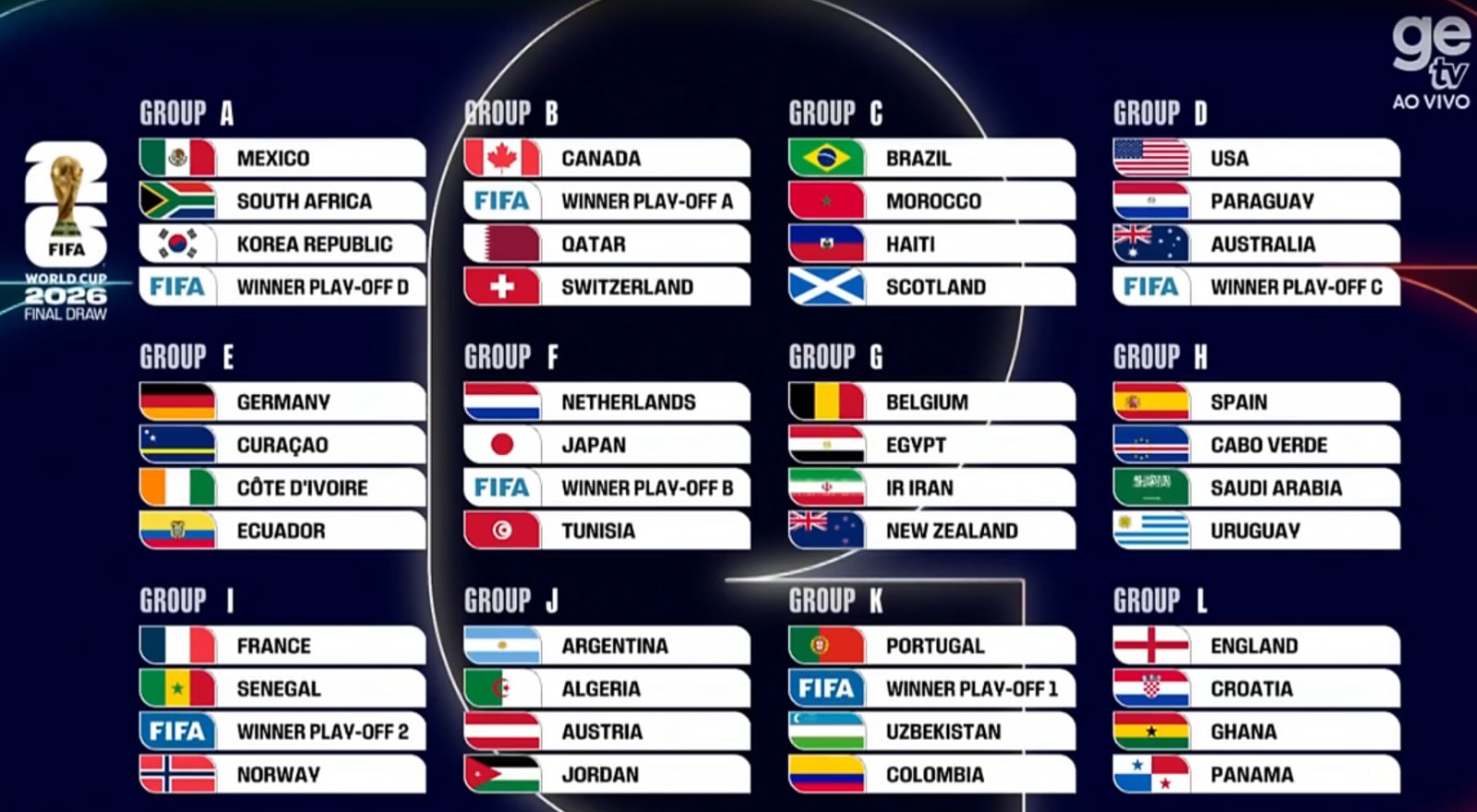 O Brasil está ao lado de Marrocos, Escócia e Haiti no Grupo C da Copa do Mundo de 2026, que será disputada nos Estados Unidos, no México e no Canadá. A chave da seleção brasileira na competição, que será realizada entre 11 de junho e 19 de julho de 2026, foi definida nesta sexta-feira (5) através de sorteio realizado no Kennedy Center, em Washington (Estados Unidos). A estreia do time comandado pelo técnico italiano Carlo Ancelotti será no dia 13 de junho, diante dos marroquinos, ainda em local a ser definido.