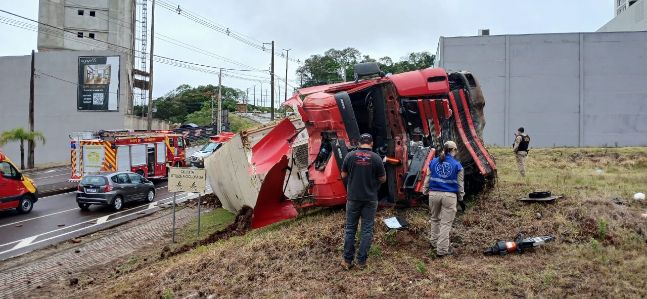 O condutor pulou do caminhão em movimento e não teve ferimentos. Já a condutora de um veículo que foi atingido teve ferimentos e foi levada ao hospital. SAMU, Corpo de Bombeiros, Polícia Militar e Debetran foram acionados para o local. Em breve mais informações. No trevo há placa de sinalização proibindo o trânsito pesado para quem acessa o a Julio Assis, vindo da Rodovia Vitório Traiano (PR-180).