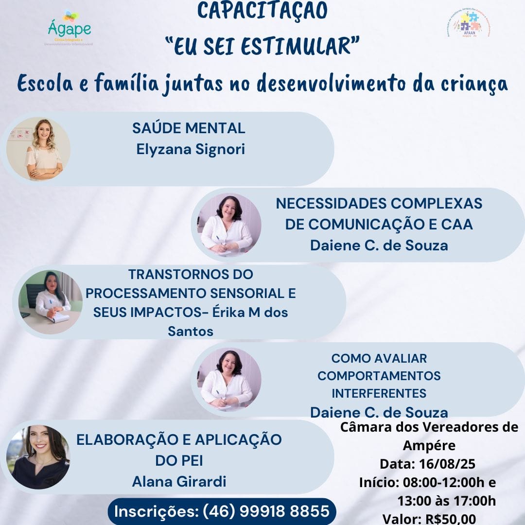 O evento acontece das 8h às 12h e das 13h às 17h, reunindo profissionais de diferentes áreas para abordar temas essenciais no desenvolvimento infantil. Entre os assuntos, estarão saúde mental, necessidades complexas de comunicação e CAA, transtornos do processamento sensorial e seus impactos, como avaliar comportamentos interferentes e elaboração e aplicação do PEI.