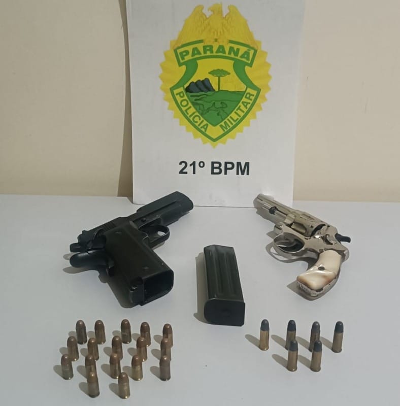 Ao chegarem, os policiais avistaram o casal suspeito tentando se esconder atrás de um caminhão e descartando objetos ao solo. Durante a abordagem, nada de ilícito foi encontrado com os dois, mas, ao verificar o que haviam jogado, a equipe localizou uma pistola Imbel calibre .380 com 17 munições e um revólver calibre .32 com seis munições intactas.