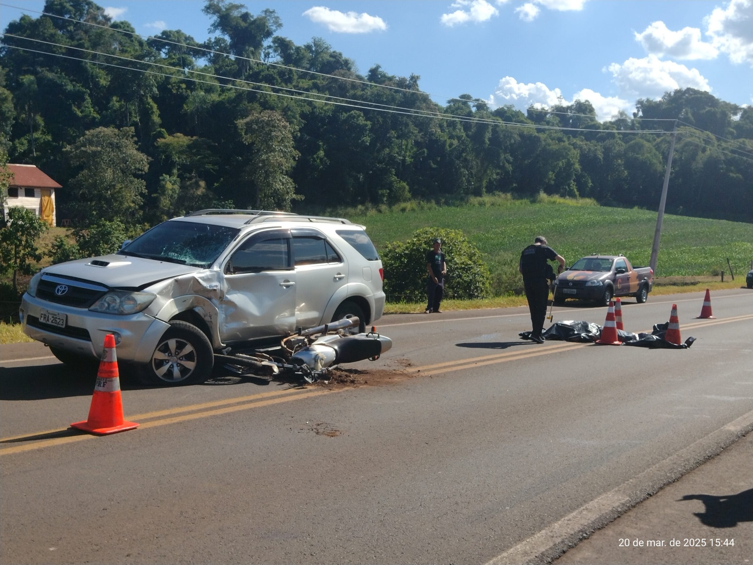 Uma colisão frontal deixou uma vítima fatal na BR-163, no quilômetro 112, na tarde desta quarta-feira. O acidente envolveu uma motocicleta Honda CG e um automóvel Toyota Hilux SW4. A vítima foi identificada como Sidney Shuster, de 42 anos, morador da Linha Jacaré. Ele conduzia a moto no momento do impacto e não resistiu aos ferimentos.