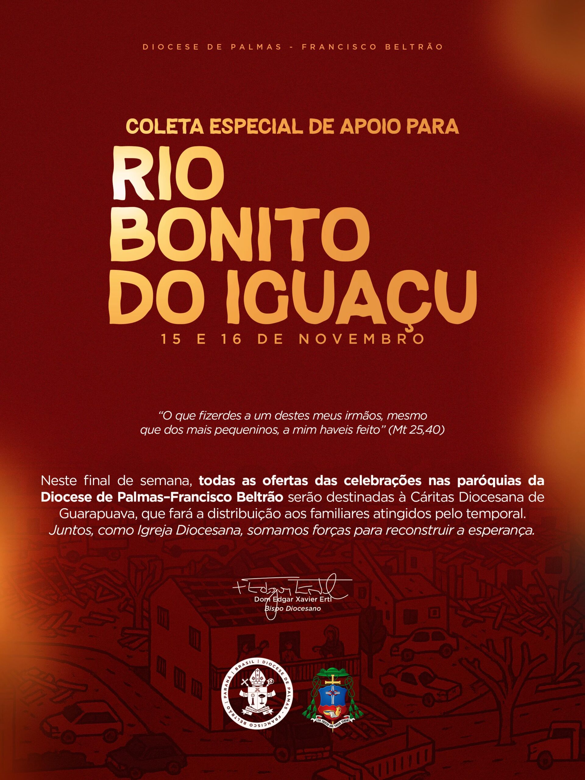 A Diocese de Palmas–Francisco Beltrão promove neste fim de semana, dias 15 e 16 de novembro, uma coleta especial de apoio às famílias atingidas pelo temporal em Rio Bonito do Iguaçu.
