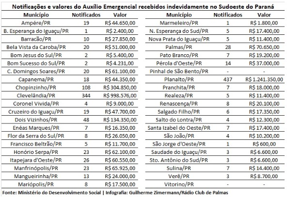 Quase 1,3 mil pessoas residentes no Sudoeste do Paraná estão sendo notificadas para devolver R$ 3,5 milhões que teriam sido recebidos de forma indevida por meio do Auxílio Emergencial, benefício criado pelo Governo Federal na pandemia de Covid-19. Os números foram levantados com exclusividade pelo Departamento de Jornalismo da Rádio Club de Palmas.