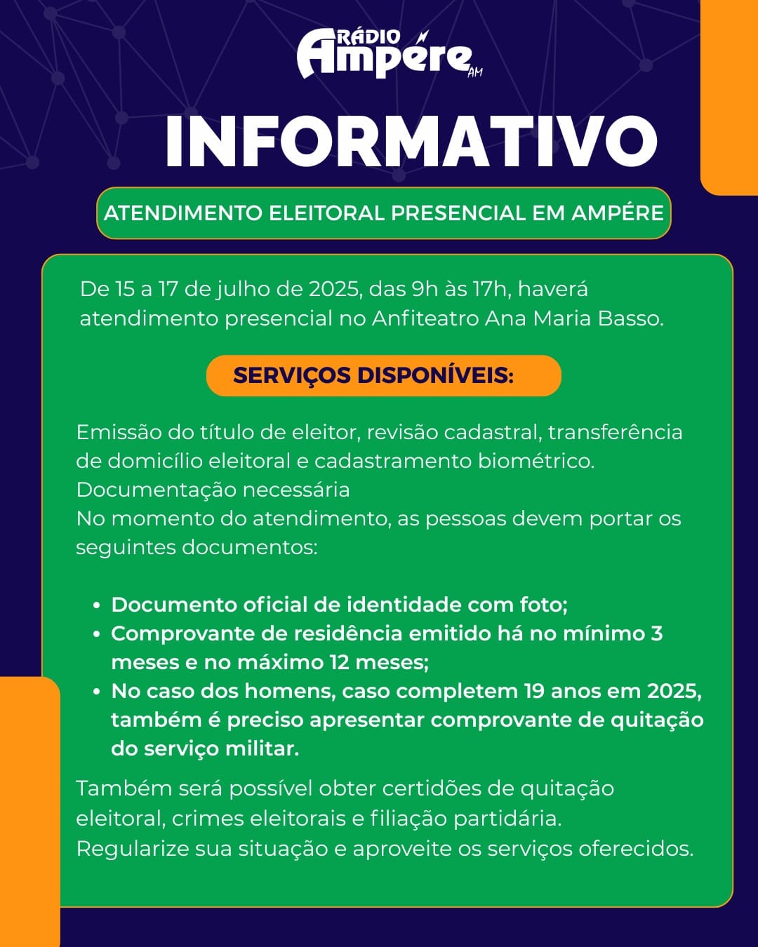 A Justiça Eleitoral realizará um mutirão de atendimento presencial em Ampére nos dias 15, 16 e 17 de julho de 2025, das 9h às 17h, no Anfiteatro Ana Maria Basso. A ação tem como objetivo facilitar o acesso da população aos serviços eleitorais, sem a necessidade de deslocamento a outros municípios.