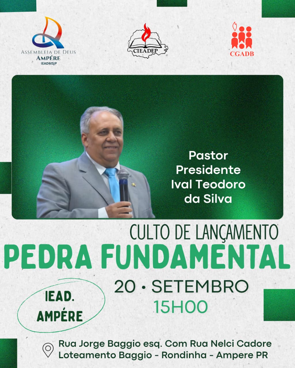 Acontece em Ampére o culto de lançamento da pedra fundamental da construção da Igreja Evangélica Assembleia de Deus – Paraná. O evento será neste sábado, 20, com a presença do pastor presidente Ival Teodoro da Silva, que lidera mais de 70 igrejas e mantém diversos projetos missionários e sociais no Brasil e no exterior. Em Ampére, a igreja é conduzida pelo pastor João Rene de Paula.