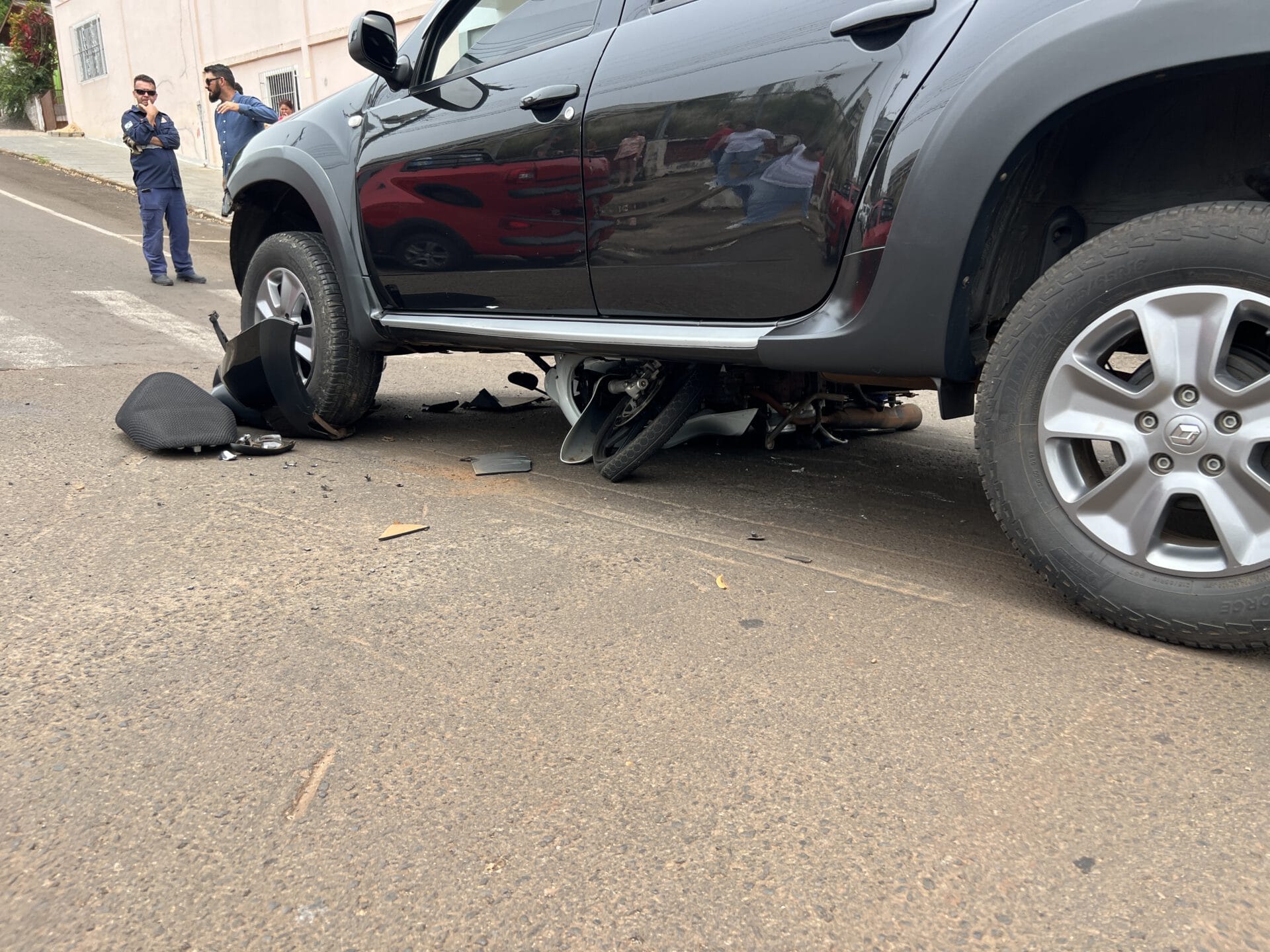 Uma cena chamou atenção em um acidente no centro de Ampére, neste sábado, 12. Uma moto ficou destruída após colidir e parar embaixo de um veículo, por volta das 12h. A ocorrência foi no cruzamento das ruas dos Andradas com Presidente Kennedy. Uma pessoa ficou ferida.