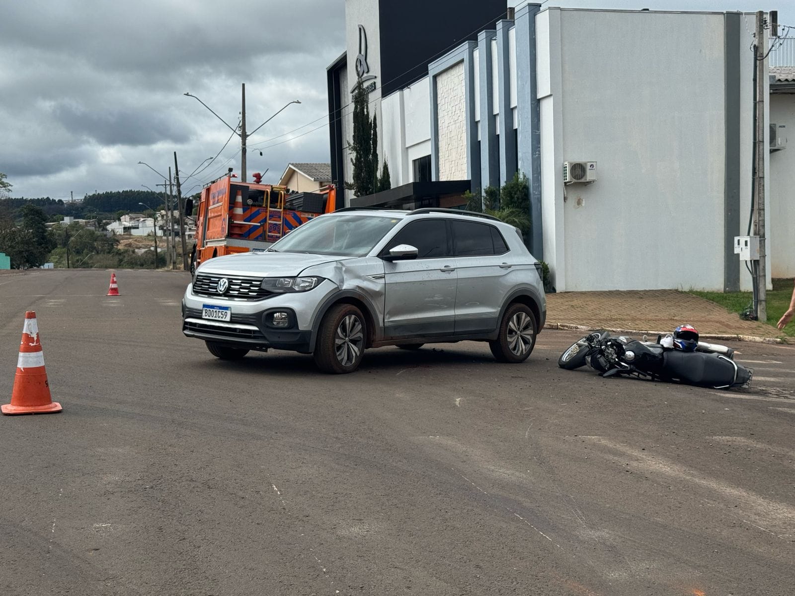 Um acidente de trânsito foi registrado no início da tarde desta segunda-feira, 28, no cruzamento das ruas Souza Naves com Goiânia, no bairro Santa Mônica, em Ampére. A colisão envolveu uma motocicleta Honda 150 e um veículo Volkswagen T-Cross.