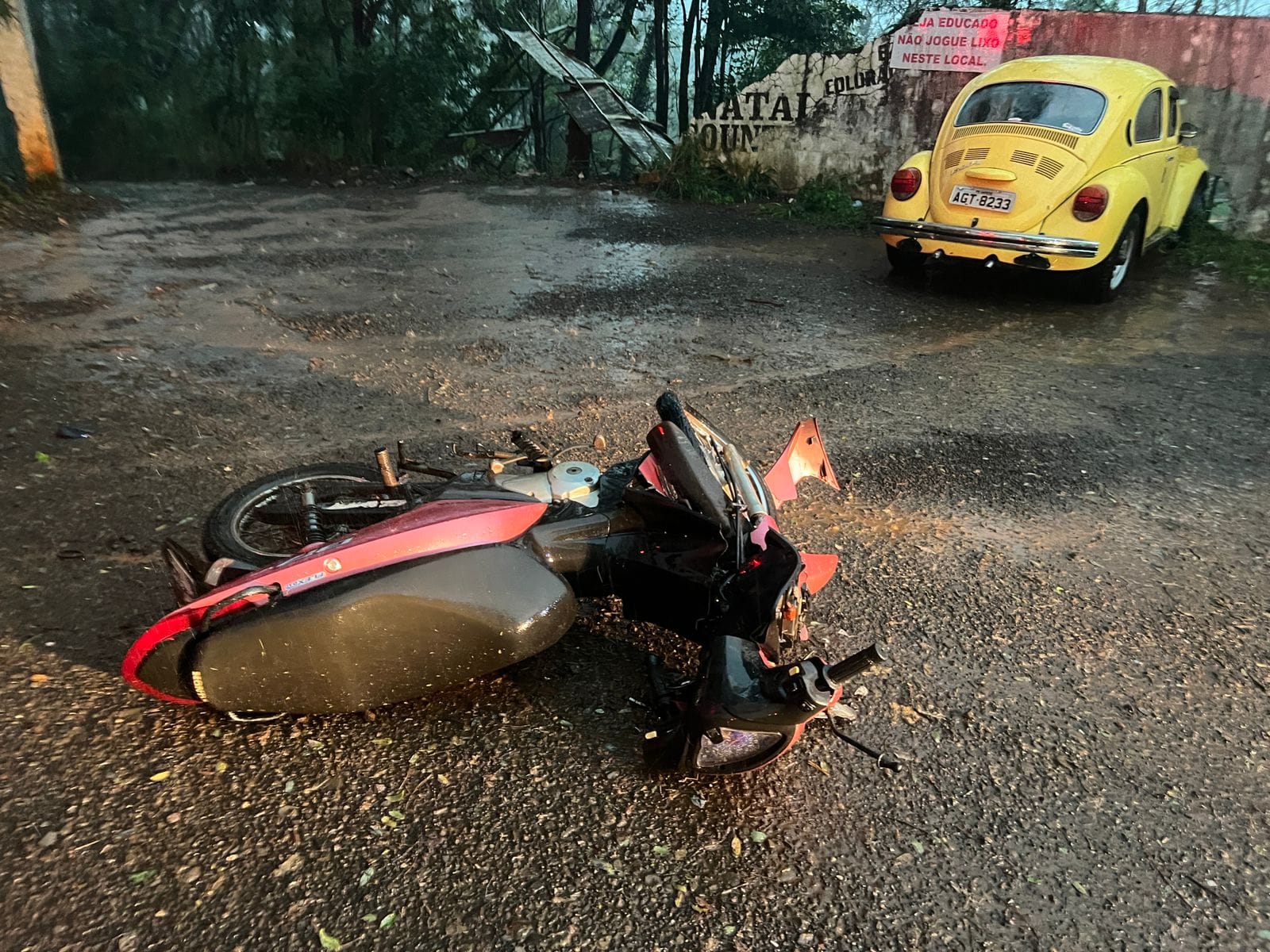 Envolveram-se na colisão um Volkswagen/Fusca e uma motocicleta Honda/Biz.