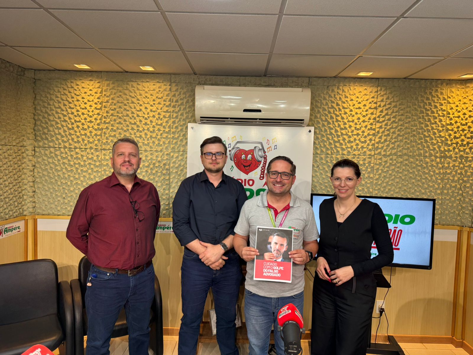 Os advogados Andréia Puton, representante da OAB, Rodrigo Tubiana, da Comissão de Direito Previdenciário, e Matheus Penso, da Comissão de Direito da Pessoa com Deficiência e da Criança e do Adolescente, participaram do Jornal RA – 2ª Edição desta quarta-feira, 19, para alertar a população sobre a crescente onda do golpe do falso advogado na região sudoeste do Paraná.