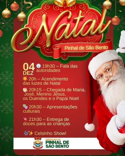 A programação começa às 19h30, com o pronunciamento das autoridades municipais, seguido pelo aguardado acendimento das luzes de Natal, às 20h — um dos momentos mais simbólicos da noite. Logo depois, às 20h15, ocorre a chegada especial de Maria, José, o Menino Jesus, os Duendes e o Papai Noel, marcando o início oficial das festividades natalinas.