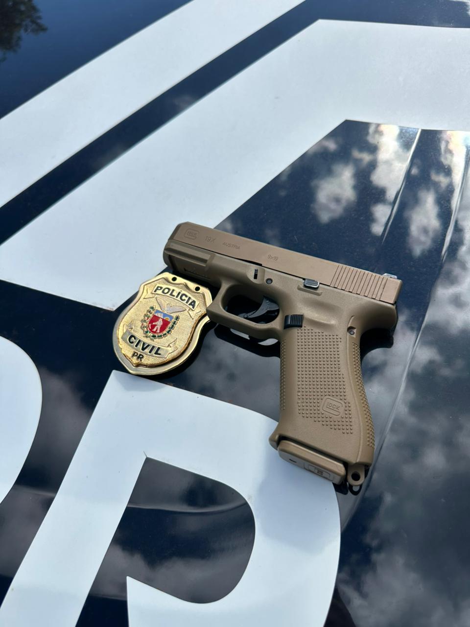 Em continuidade ao trabalho de investigação, equipes da Polícia Civil identificaram o veículo utilizado no crime — uma Caminhonete, que foi localizada e apreendida na cidade de Ubiratã/PR, Oeste do Estado, com apoio da Polícia Civil local. Durante as diligências, também foi apreendida a arma utilizada no fato, uma pistola Glock, calibre 9 mm, a qual passará por exames periciais.