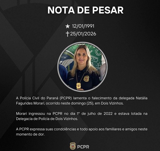 “A 19ª Subdivisão Policial de Francisco Beltrão e a 60ª Delegacia Regional de Dois Vizinhos manifestam profundo pesar pelo falecimento da Delegada de Polícia Natália Fagundes Morari, ocorrido na manhã de hoje. Colega querida e profissional exemplar, cuja memória permanecerá entre nós com carinho e saudade. Neste momento de imensa dor, nos solidarizamos com os familiares, amigos e companheiros de profissão, desejando que encontrem conforto, força e amparo neste momento tão difícil”.