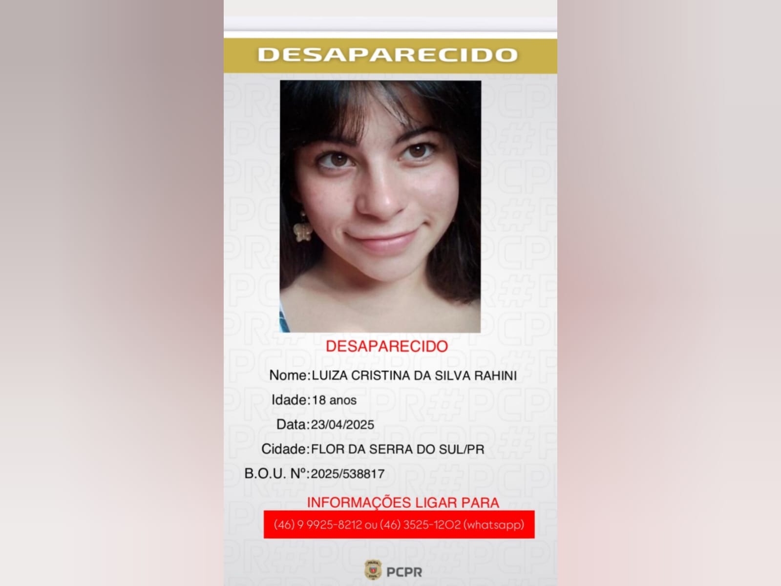 A Polícia Civil do Paraná (PCPR) solicita a colaboração da população com informações que possam auxiliar na localização de Luiza Cristina da Silva Rahini, 18 anos, desaparecida desde o dia 23/04/2025, no município de Flor da Serra do Sul.