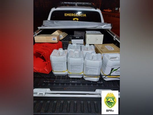 O veiculo e a mercadoria foram encaminhados para a Receita Federal. Já por volta de 18h na PR-481 em Santo Antônio do Sudoeste foi abordado um veículo onde foram localizadas 30 caixas de vinhos argentinos. O condutor informou o local onde carregou a mercadoria, onde foram localizadas mais 54 caixas de vinho e 06 galões de agrotóxicos de origem Argentina. O veículo e carga foram encaminhados para a Receita Federal e Santo Antônio do Sudoeste.