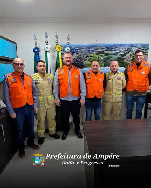 Nesta semana o prefeito de Ampére, Douglas Potrich, recebeu em seu gabinete representantes da Brigada Comunitária e da Defesa Civil do município para a entrega oficial de novos coletes de identificação. Estiveram presentes o vice-prefeito Celso Saggiorato, o secretário de Administração Evandro Dal’Vesco, os sargentos Reis e Marcelo, coordenadores do Posto da Brigada Comunitária, e o coordenador da Defesa Civil local, Luiz Rodrigues.