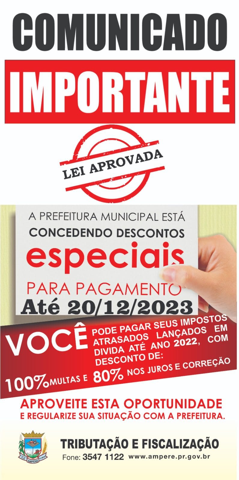 A lei que permite o contribuinte impostos atrasados já está valendo em Ampére. A prefeitura concede descontos especiais para pagamentos até 20 de dezembro de 2023. Os descontos são de 100% nas multas e 80% nos juros e correção. Informações pelo 46 3547 1122.