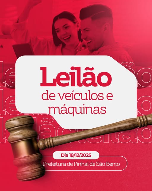 A Prefeitura de Pinhal de São Bento realizará, no dia 18 de dezembro de 2025, a partir das 9 horas, um Leilão Público Presencial – Edital nº 02/2025, com a finalidade de alienar veículos e máquinas pertencentes ao patrimônio municipal. O evento acontecerá na Garagem Municipal, localizada na Avenida São Roque, 178, mesmo local onde os bens estão disponíveis para vistoria.