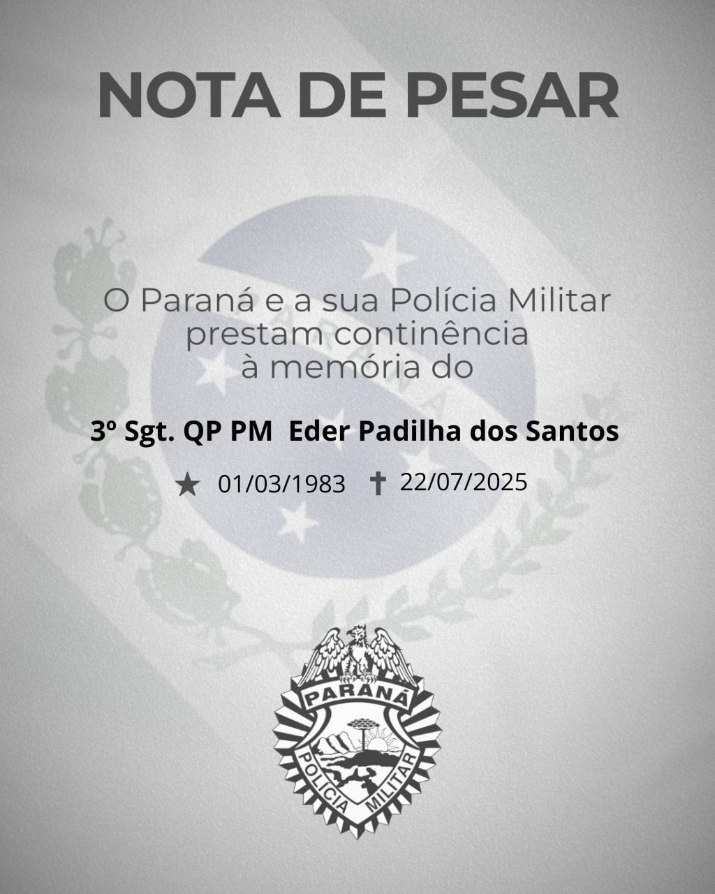 É com grande pesar que a Polícia Militar do Paraná, através do 21º BPM, comunica o falecimento do 3° Sargento QP PM Eder Padilha dos Santos, em 22 de julho de 2025, aos 42 anos de idade.
