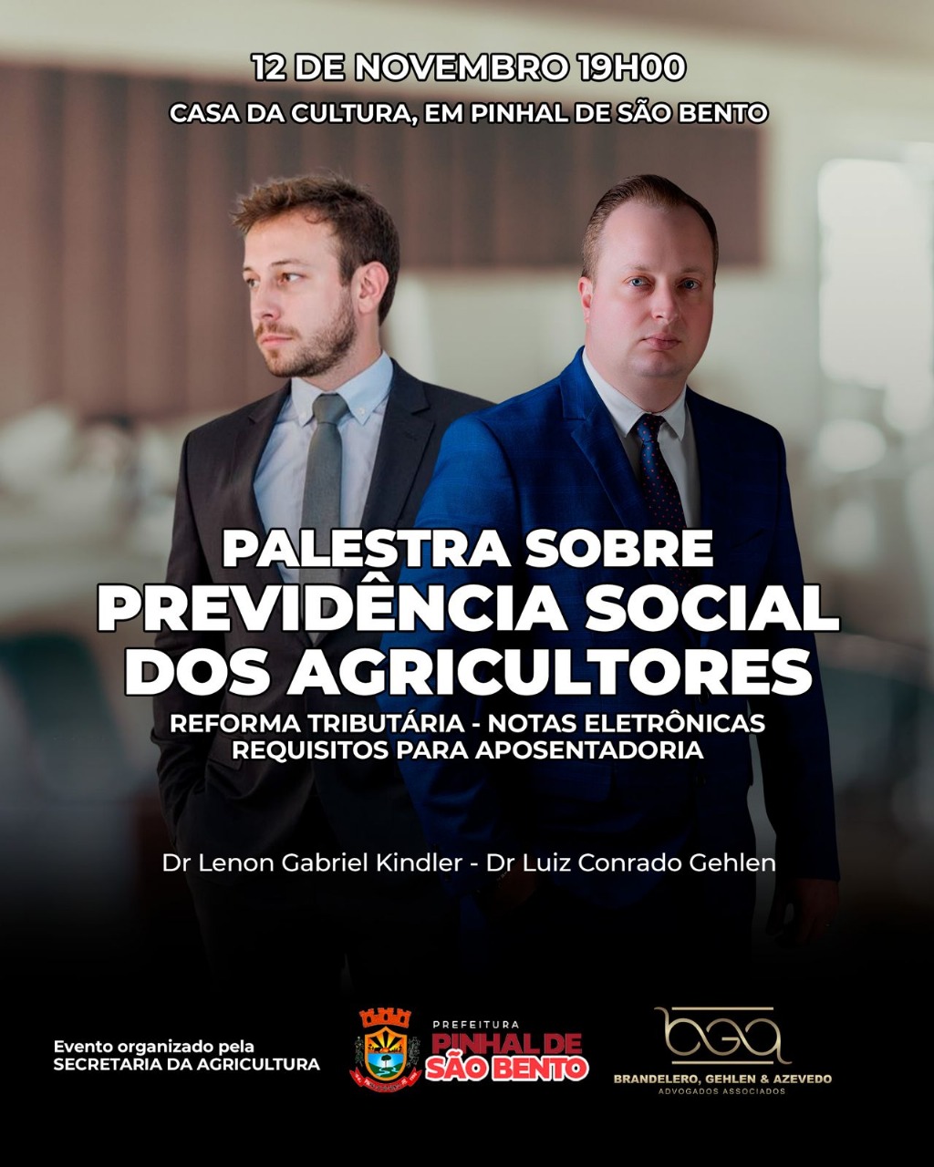 A Secretaria da Agricultura de Pinhal de São Bento convida todos os agricultores do município para participar da palestra sobre Previdência Social dos Agricultores, que será realizada nesta quarta-feira, 12, às 19h, na Casa da Cultura.