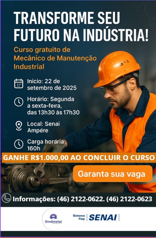 O SENAI de Ampére está com inscrições abertas para o curso gratuito de Mecânico de Manutenção Industrial. A formação terá início no dia 22 de setembro de 2025, com aulas de segunda a sexta-feira, das 13h30 às 17h30, na unidade local do SENAI.