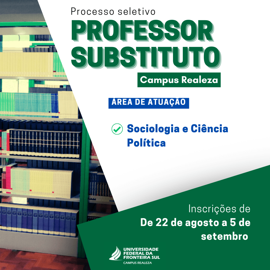 A Universidade Federal da Fronteira Sul (UFFS) – Campus Realeza está com inscrições abertas para o processo seletivo simplificado para a contratação de professor substituto na área de Sociologia e Ciência Política. Os interessados têm até o dia 5 de setembro para realizar a inscrição de forma eletrônica e gratuita.
