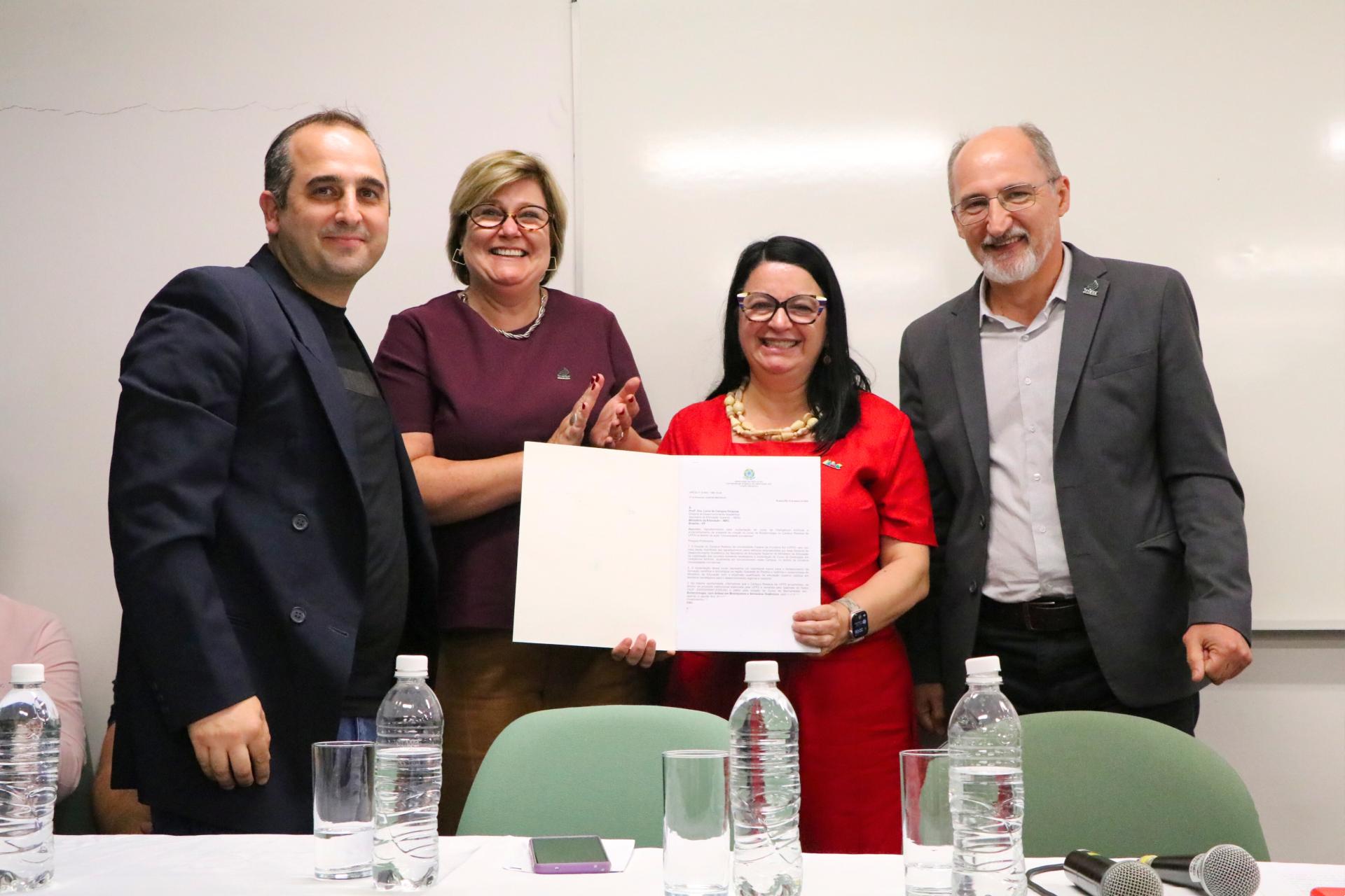 O evento contou com a presença da Diretora de Desenvolvimento Acadêmico da Secretaria de Educação Superior do Ministério da Educação (MEC), Lúcia Campos Pellanda. O novo curso em Realeza integra a ação “Universidades Inovadoras”, programa do MEC para a expansão de cursos que fortaleçam a formação em áreas ligadas à inovação, à ciência e ao desenvolvimento tecnológico no país. A primeira seleção da turma ocorreu pelo Sistema de Seleção Unificada (Sisu), sendo ofertadas 60 vagas. As aulas da primeira turma iniciaram no dia 2 de março. Nesta terça-feira (17), o Campus Erechim realiza cerimônia semelhante para implantação do bacharelado em Ciência da Computação, também contemplado no programa.