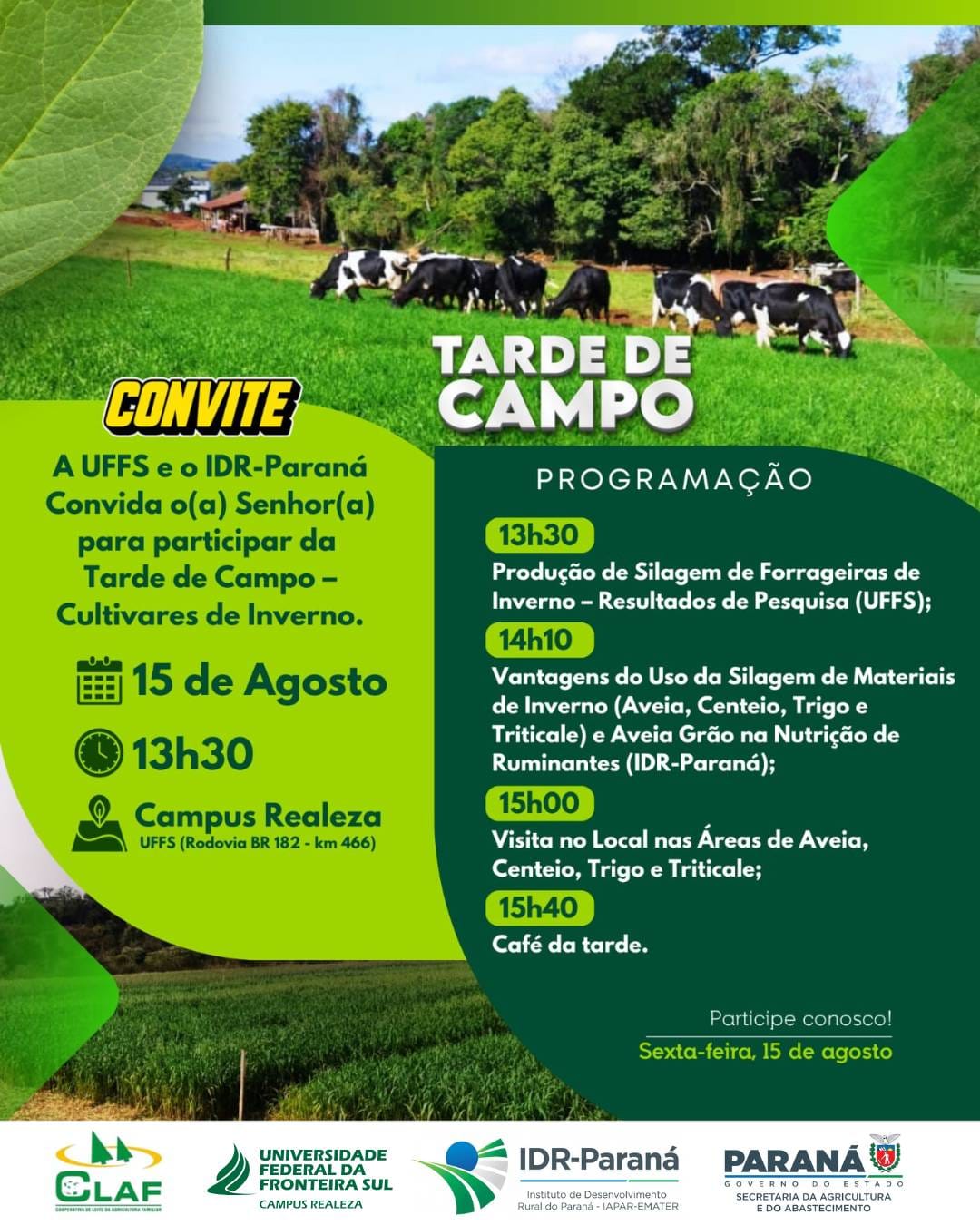 A Universidade Federal da Fronteira Sul (UFFS) – Campus Realeza, em parceria com o Instituto de Desenvolvimento Rural do Paraná (IDR-Paraná), realiza no dia 15 de agosto (sexta-feira) a II Tarde de Campo: Cultivares de Inverno. O evento tem como objetivo difundir conhecimentos científicos e práticos sobre o cultivo de forrageiras de inverno para produção de silagem, garantindo alimentação animal de alta qualidade ao longo do ano.