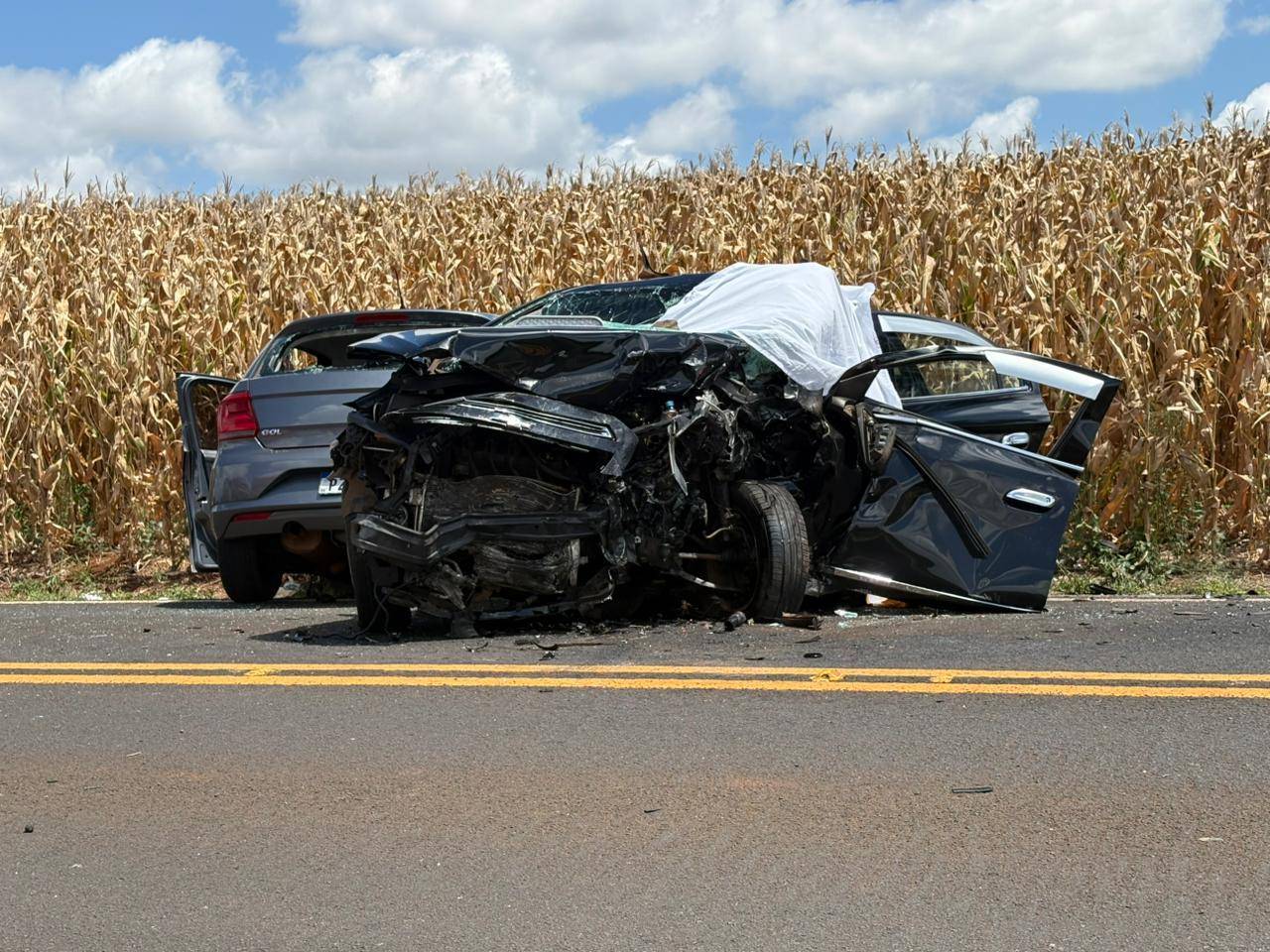 Uma forte colisão frontal envolvendo um GM/Prisma e um VW/Gol foi registrada na manhã deste sábado (28), por volta das 11h20min, na altura do Km 494, no trecho que liga São Jorge D’Oeste a São João.